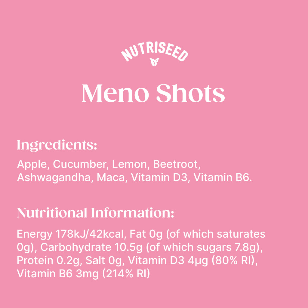 Find balance and support your wellbeing with Nutriseed Menoshots – the daily shot designed especially for women. Crafted with cold-pressed apple, cucumber, lemon and beetroot, and enriched with Ashwagandha, Maca, Vitamin B6 and Vitamin D3, Menoshots provide targeted nutrition to help you feel your best every day.
