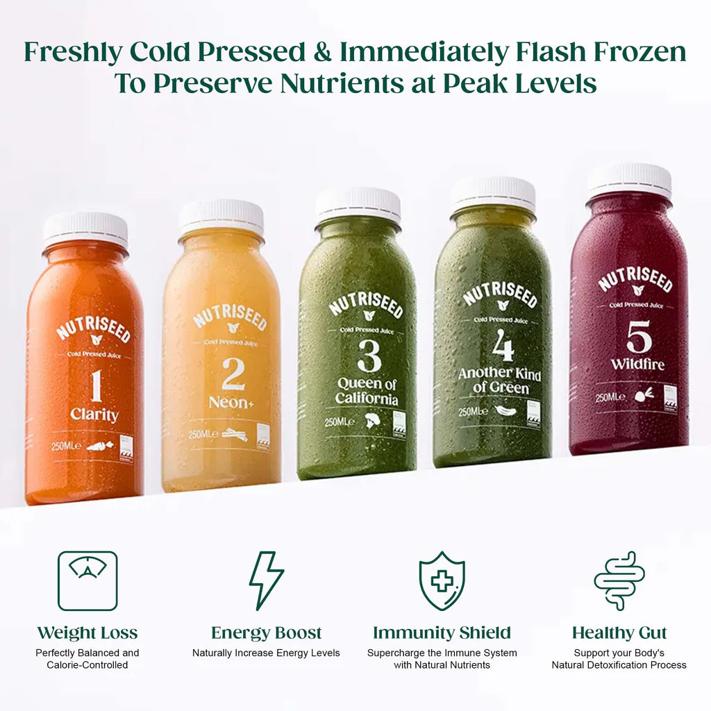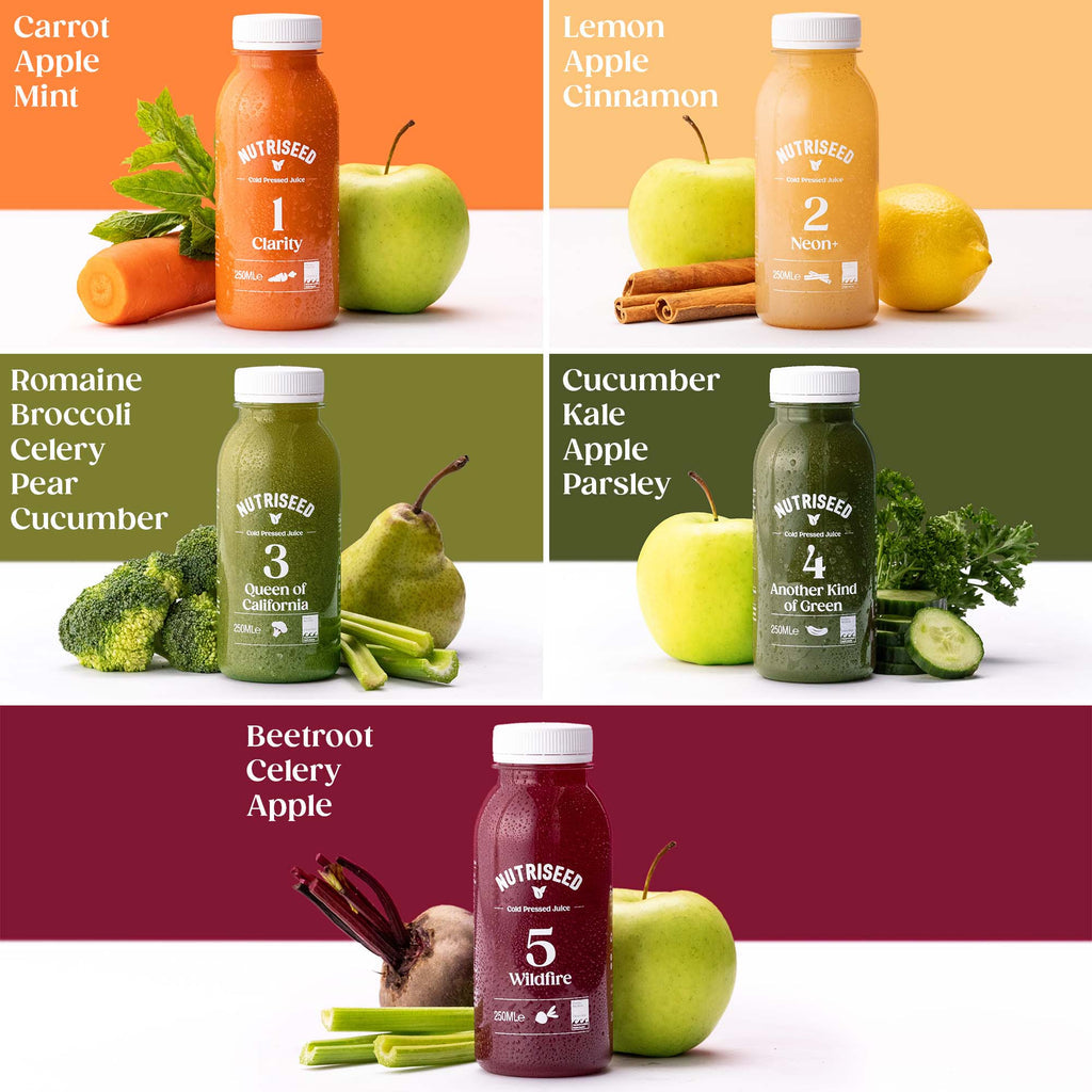 The Nutriseed Cold-Pressed Diet is offered as a 3, 5, 7, 10-Day juice fast, with 5 different juices supplied for each day.