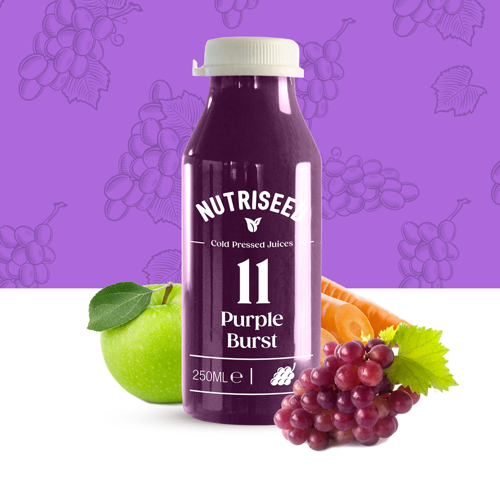 Apple, Grapes, Orange, Cabbage, Carrot, Lime, Ginger.|Exploding into the range in a riot of colour, Purple Burst is a taste sensation that takes you totally by surprise. Rich and sweet, with a subtle tang - like summer in a bottle! ---