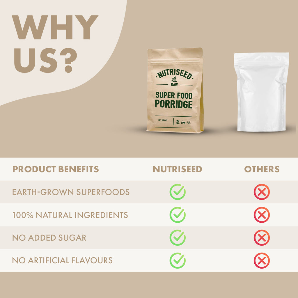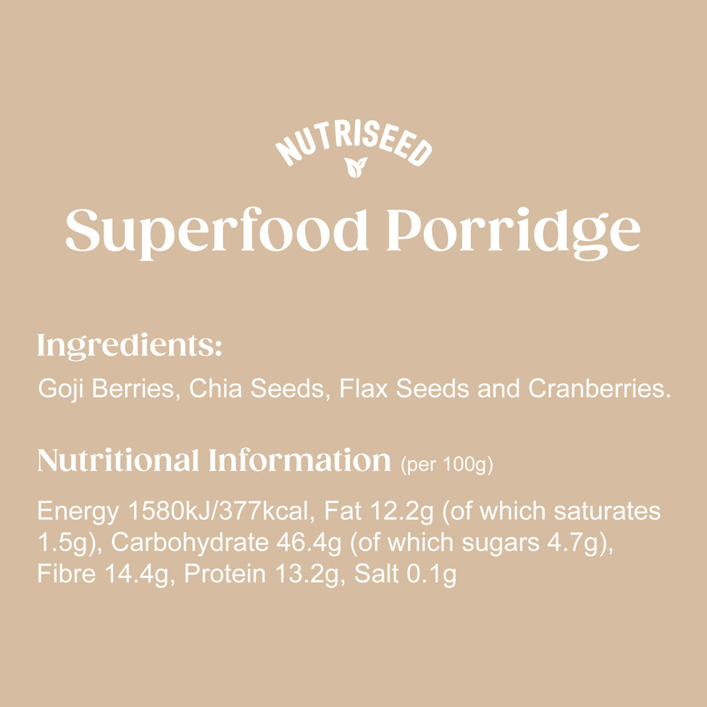 Each of the ingredients contained in Superfood Porridge are sourced separately from different corners of the world.  The ingredients are then carefully blended together by our team at Nutriseed headquarters in London.